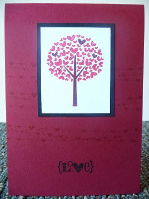 I’ve used the stamp set Love Defined from the Summer Mini Catalogue. This set has 8 images in it and I love this tree from the set. You could do so many things with it. For this image I have used a Cherry Cobbler marker pen and coloured the image direct to rubber, then I have gone over the trunk and three of the hearts with a Basic Black marker, done a “huff” on the stamp to moisten the ink and stamped up the image onto Whisper white card. This was mounted onto Basic Black card and then mounted on Cherry Cobbler card on which I had stamped the heart strings and sentiment from Love Defined.