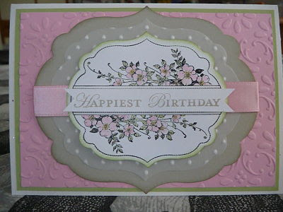 Any way back to my card! The stamp set is Apothecary Art. I am so pleased this stamp set continued from the recent mini catalogue into the new 2013 catalogue. There is a retiring item used on this card and that is the embossing folder – Finial Press, oops there’s two items! The Pretty in Pink satin ribbon is also retiring, along with all the other satin ribbons. Better get an order in by August 31 if you are a lover of satin ribbon!
