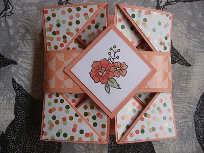 Time to show off my card sample for my April classes. This month I will be teaching you how to create a napkin/serviette card. As usual I am having a lot of fun coming up with colour creations and designs!