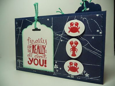 I originally designed the style and colours of this card to be a Father’s Day card as an option for my class ladies. Father’s Day in Australia is the first weekend of September. However as I already have several Father’s day cards made up and not requiring more I made the card into a male birthday card but my class ladies can opt for a Father’s Day version if so desired. The cute little crab and lobster stamps come from a stamp set called Sea Street.