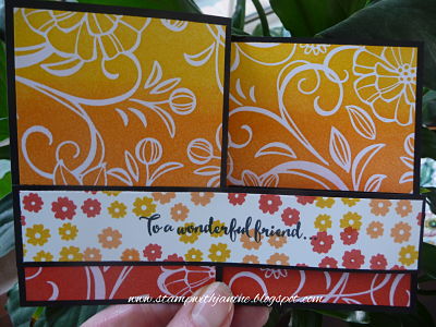 I used Stampin’Up! sponge brayers to apply the ink to the card, gradually building up the colour intensity to the desired brightness required. Ink colours are Crushed Curry, Peekaboo Peach and Watermelon Wonder.