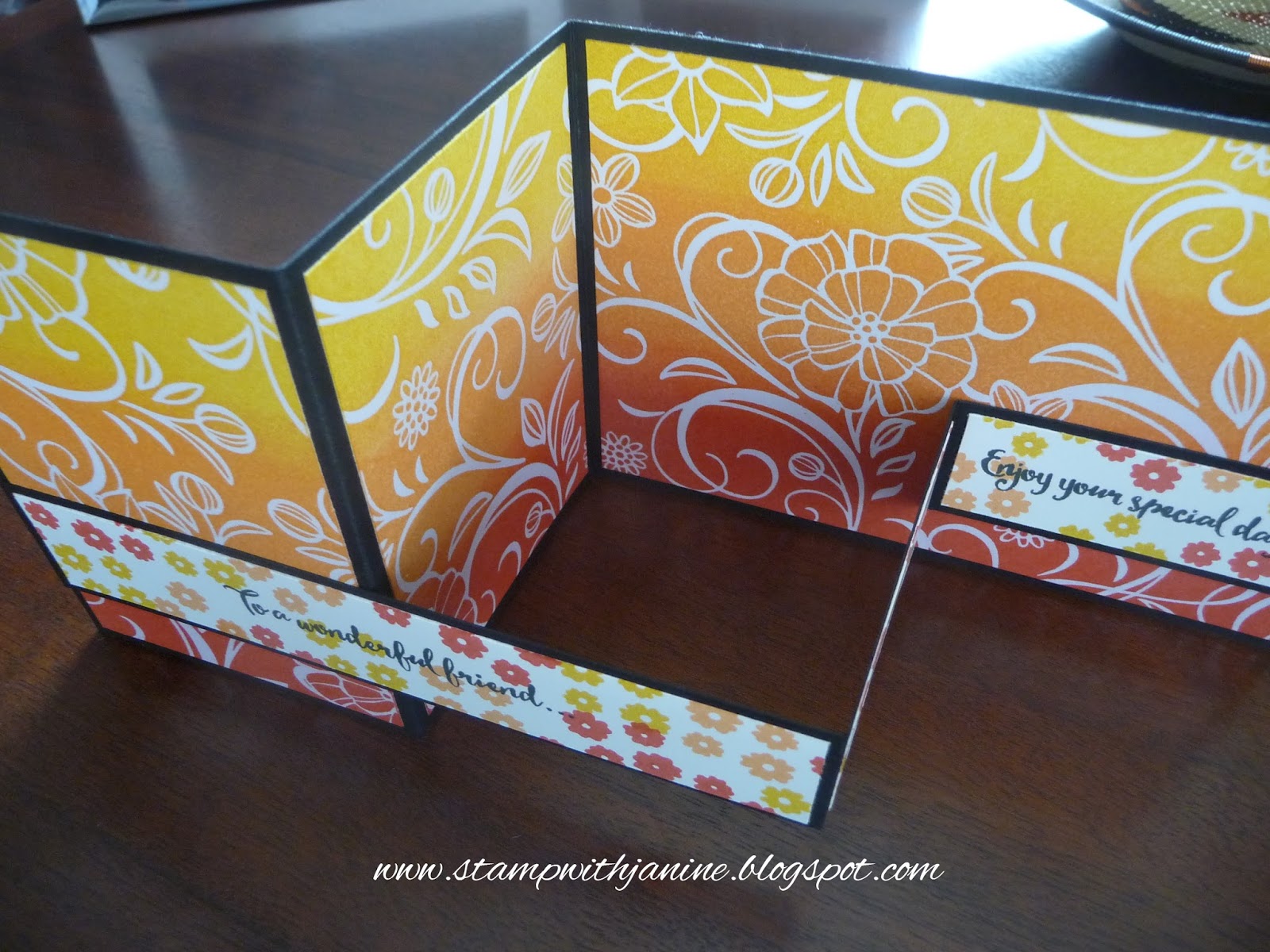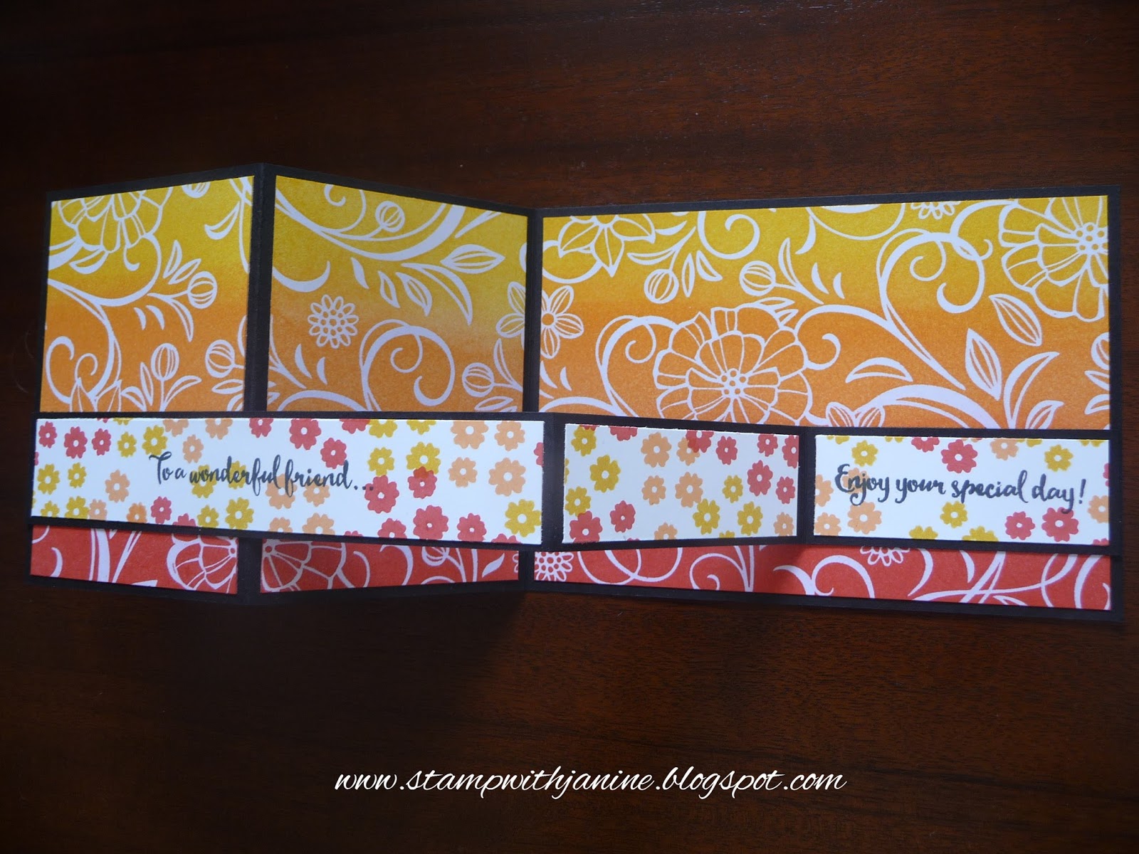 I used Stampin’Up! sponge brayers to apply the ink to the card, gradually building up the colour intensity to the desired brightness required. Ink colours are Crushed Curry, Peekaboo Peach and Watermelon Wonder.