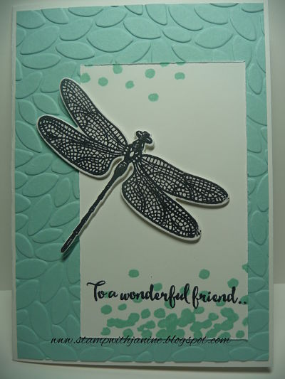 The dragonfly is stamped using Memento Black ink and a wash of Wink of Stella Clear applied over the wings to make them sparkle. It is always so hard to show it in a photo!