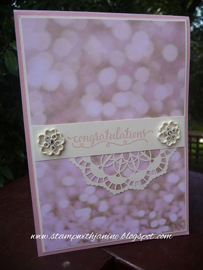 My last post featured the elegant Falling in Love embellishments and here they are again along with the Lace Doilies also from the Falling in Love Suite of products. The doilies are versatile as they are Very Vanilla on one side and Whisper White on the other.