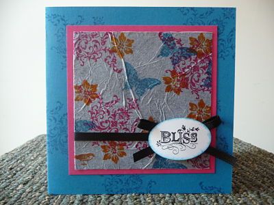 I must admit to making a boo-boo with this card! I had planned to mount the finished faux silk tissue piece onto white card then onto a black matt but instead got totally distracted while creating and stuck my stamped tissue paper onto the black matt and not the white card. I did not realise until I had finished the card!!!!! I don’t think it ended up too bad, in fact the effect grew on me as I had it sitting on my desk for the next few days!