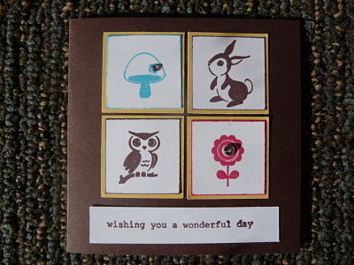 Finished it all off with a bit of bling on the toadstool and flower. The bling is the funny looking shadow!!!! Just realised the flower comes from the Funky Four stamp set! Another really cute set!