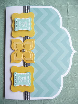 To frame the stamped punch piece I punched out Pool Party card with the Petite Curly punch, cut them in half, trimmed off the pointy bits and adhered them under the edges of the sentiment pieces. A very nifty little way to take your cards up to the next step!