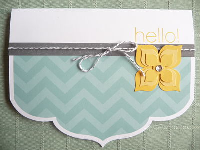 So I have still used items in the kit – the Baker’s twine, the cardstock sticker strip, the sticker flowers and rhinestones and then I’ve added another couple of Sale-a-bration items to jazz the card up a bit more. The stamp comes from “Pretty Petites” and it has a matching new punch released for Sale-a-bration – Petite Curly label punch. Don’t you just love them!!! So cute!!!! The Petite Curly label punch has been layered up onto the regular curly label punch, which just happens to fit perfectly over the printed “hello” sentiment on the card.