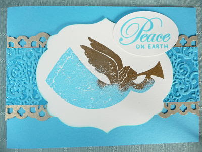 I have created the two tone effect on the angel by stamping the angel onto Whisper White card with Versamark. then I sprinkled gold embossing powder just on the wings, head and horn. I shook off the excess making sure to tip the card in a direction that the powder would not go over the other parts of the image. then I sprinkled Tempting Turquoise embossing powder over the rest of the image tapped off the excess and heat set it with a heat gun.