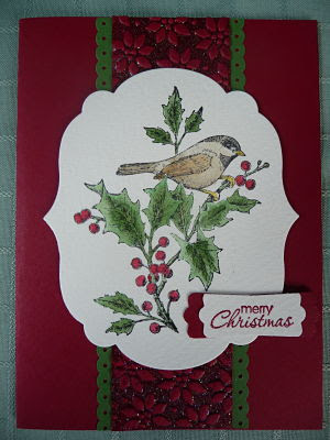 Here is my first creation using the stamp set Beautiful Season. I stamped it with black Staz-On ink onto watercolour paper and coloured it using inks and a blender pen. I added a twist to my card by heat embossing the Petals-a-Plenty embossed card piece by brayering the embossing folder with Versamark ink and once out of the Big Shot I sprinkled iridescent ice embossing powder over the piece and heat set it with a heat gun. It adds a lovely sparkle to the card. The background card is Cherry Cobbler and the trim is Garden Green. I used Cherry Cobbler embossing powder for the Christmas sentiment which was then punched out using the Modern Label punch.
