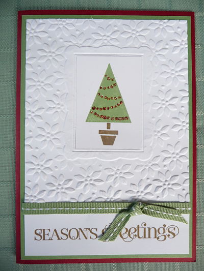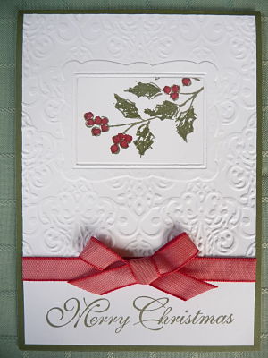 This one uses the stamp sets Watercolour Winter and Greetings from the Season from the new Holiday Seasonal catalogue due out September 1st. Notice too the embossing folder I used – Lacy Brocade also from the same catalogue.