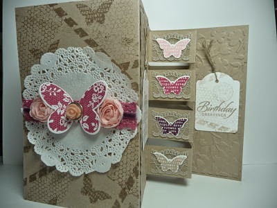 I have traded using patterned papers for embossed card. I used the Spring Flowers embossing folder. You can find it in the Occasions catalogue. I thought the use of the Sahara Sand Lace trim was a rather inspired move to go behind the butterflies! Adds some elegance to the card! The butterfly stamp and others used on this card came from the set – Butterfly Basics, except for the birthday greeting which came from the set Wetlands.