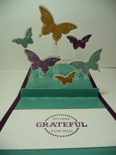 The butterflies come from the Stampin’Up! stamp set Kinda Eclectic, which we received as part of our kits when we attended the recent South Pacific Stampin’Up! Convention. I do like the new In Colours used here. The combination of Hello Honey, Lost Lagoon and Blackberry Bliss are terrific.