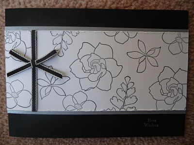 I’ve used the stamp set Growing Green and randomly stamped the images in Staz-On black ink onto Whisper White card. I roughed up the edges of the white card with the distressing tool in the cutter kit.This was then mounted onto a strip of metallic silver card after basic black one eighth inch taffeta had been caught behind the white card. A bow in the same ribbon was attached separately. The card was then adhered to a folded basic black card and the sentiment stamped in white craft ink from the hostess set Silhouette Sentiments.