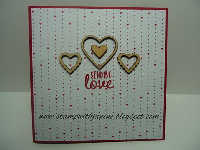 My card front is 3.75 x 3.75 Real Red card with the paper panel and then the cute wooden hearts have been added and a sentiment stamped with Real Red ink. Hearts and stamp set – Sealed with Love all are part of the Sending Love Suite in the Occasions catalogue.