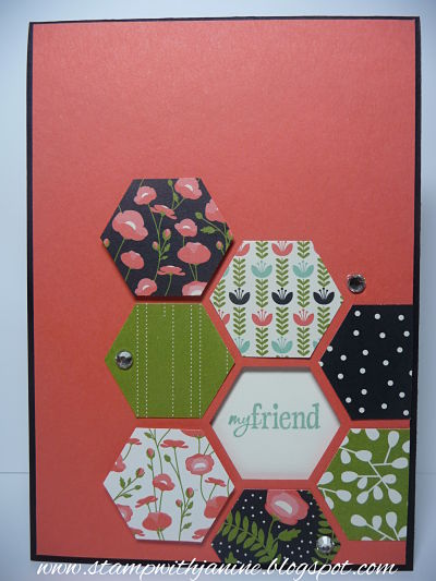 This is a quick card to create, cut your A4 card down to A5, fold in half. Cut the matt 14.3x10cm, Punch out your hexagon pieces from Designer Series Paper, punch hexagon piece out of matt. On scrap neutral card stamp your greeting, position under punched out section of matt and adhere with Dimensionals. Adhere patterned shape pieces some with Dimensionals others straight onto card with adhesive. Adhere matt to folded card with Dimensionals. Finish off with Rhinestone Basic Jewels.