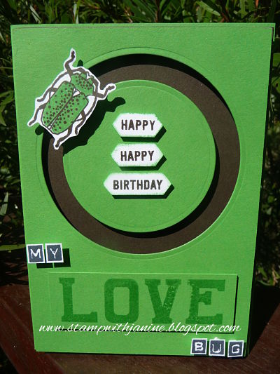 Here is a one of my sample cards for the class using the Beetles & Bugs stamp set, along with Double Take and Labeler Alphabet sets.