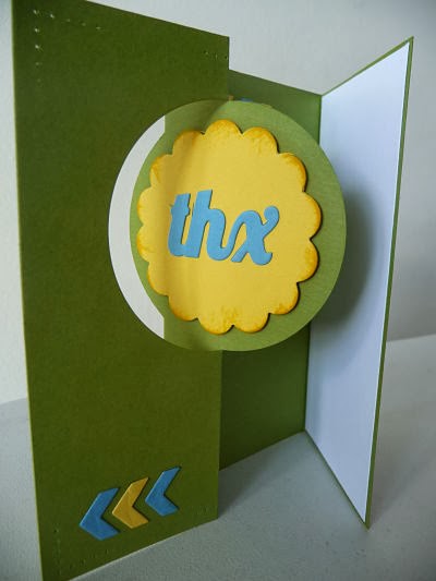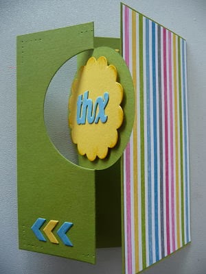 They are very hard to photograph well! Hopefully you can see how the central cut out piece swings across when you flip the card open. I used the Circle Card thinlits for my card but I have added an extra flip piece on the right side of the card. If you use the thinlit as seen in the item photo it will cut the card off at the right hand fold and that will be your finished card size.