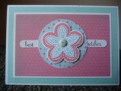 The Triple Treat Flower stamp is one of the a la carte stamps from Stampin’Up! so what this means it is a single stamp for you to buy and you can do so much with it, check out the post here. For this card I first stamped the flower in Poppy Parade and punched it out using the Fancy Flower punch, then I restamped the flower in Pool Party and punched out the inner flower using the 5 Petal flower punch. Then a Sale-a-bration Everyday Enchantment brad in the middle, adhere it all to a 2.5 inch circle punched out using that size punch and mounted onto Everyday Enchantment DSP.  The background matts are Pool Party and Very Vanilla.