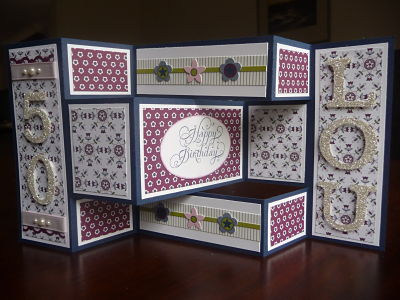 Well how to decide what to create, that was the dilemma for me! I mulled over doing a double gatefold or trying something totally different. In the end time was a factor so I chose to do a trishutter card and here it is.