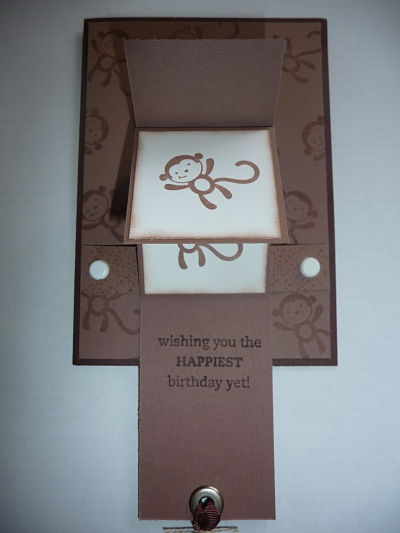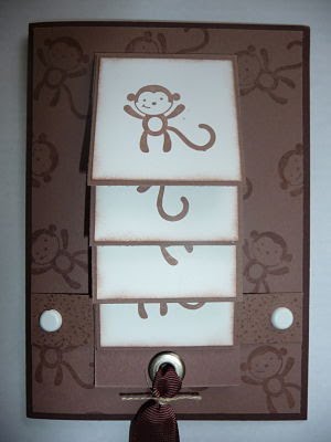 Card used is Chocolate Chip, Close to Cocoa and Whisper White. Ink used is Close to Cocoa and Versamark was used to stamp the monkey image on the CTC card. Edges of white card were softened by sponging.