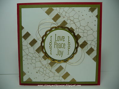 These washi tapes are gold metallic and gorgeous! I also broke open my new pack of metallic foil doilies and these matched in perfectly. Then to crown the whole card off I added my favourite annual catalogue product, gold metallic thread. The random swirling of thread behind images is all the fashion right now.